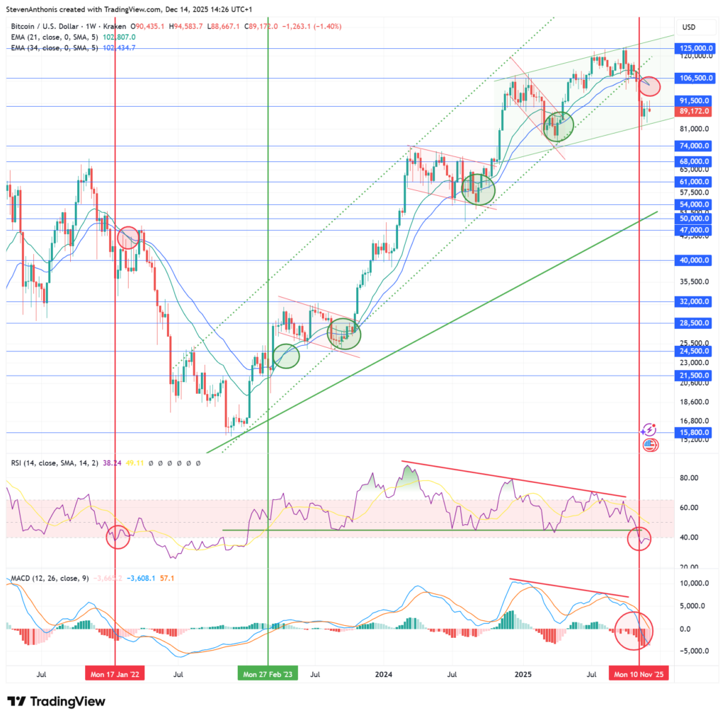 Bitcoin is flashing multiple bearish signals on the weekly chart: momentum indicators have broken key support levels, the long-term rising channel has failed, and the moving averages are crossing bearishly for the first time this cycle.